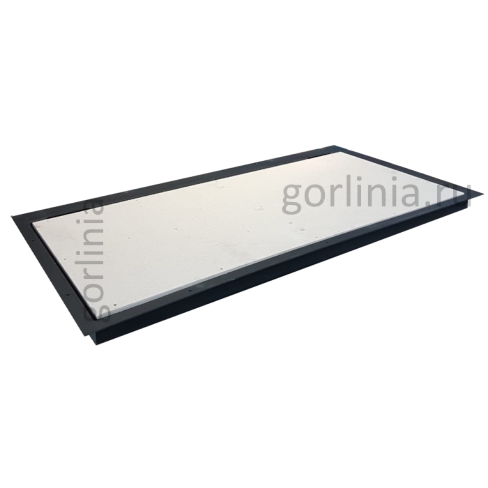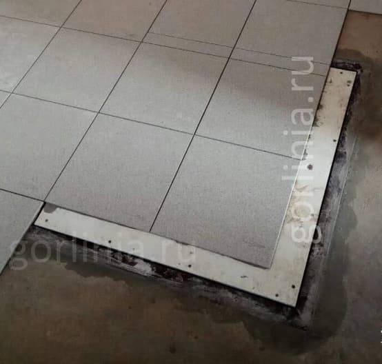 Каркас полотна сварен из трубы 30х20 в комбинированных положениях с заполнением ГВЛ в уровень наличника коробки под отделку плиткой с эффектом невидимки, сохранением рисунка и швов раскладки керамогранита в помещении. Для открывания лаза в подвал 1150х500 используется съемная ручка.