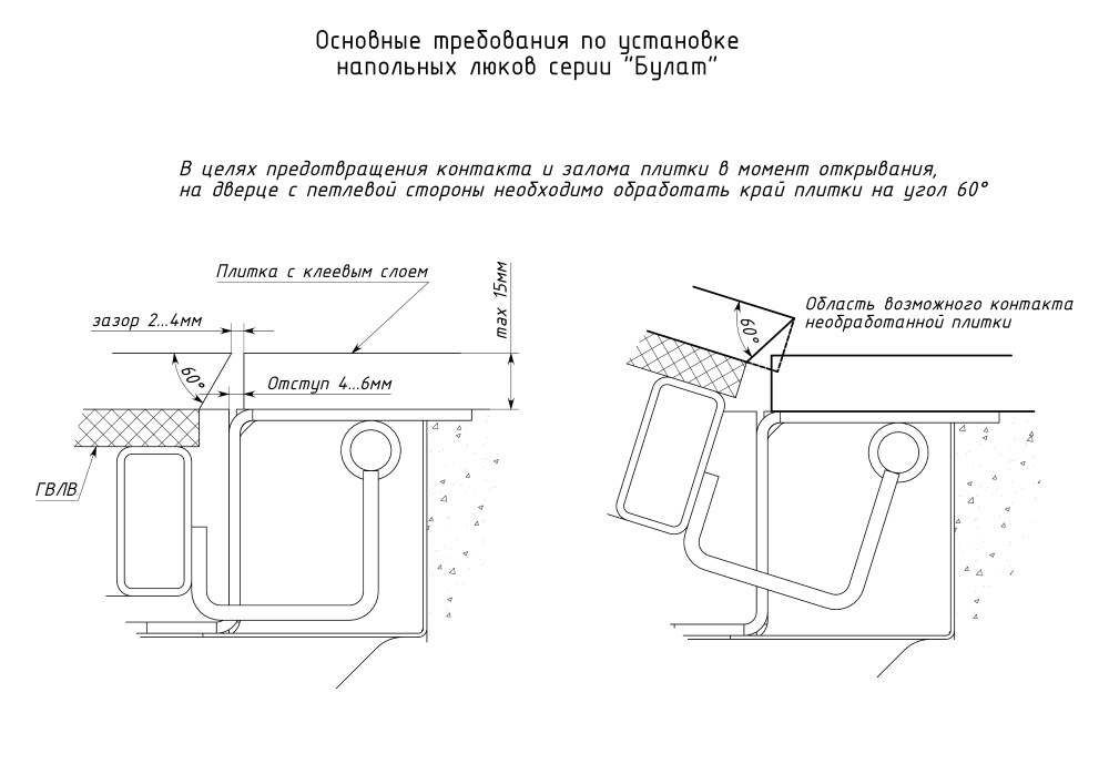 Облегченная модель без щелей в полу с уведенными за ось открывания петлями. Легкая ходовая часть и удобная установка. Просторный размер в свету 750*600 при поднятой крышке для удобного спуска по лестнице в подвальное помещение. При формировании посадочного отверстия обратите внимание, что защитные кожухи шарниров выходят за посадочную отметку по плечевой стороне (см фото).