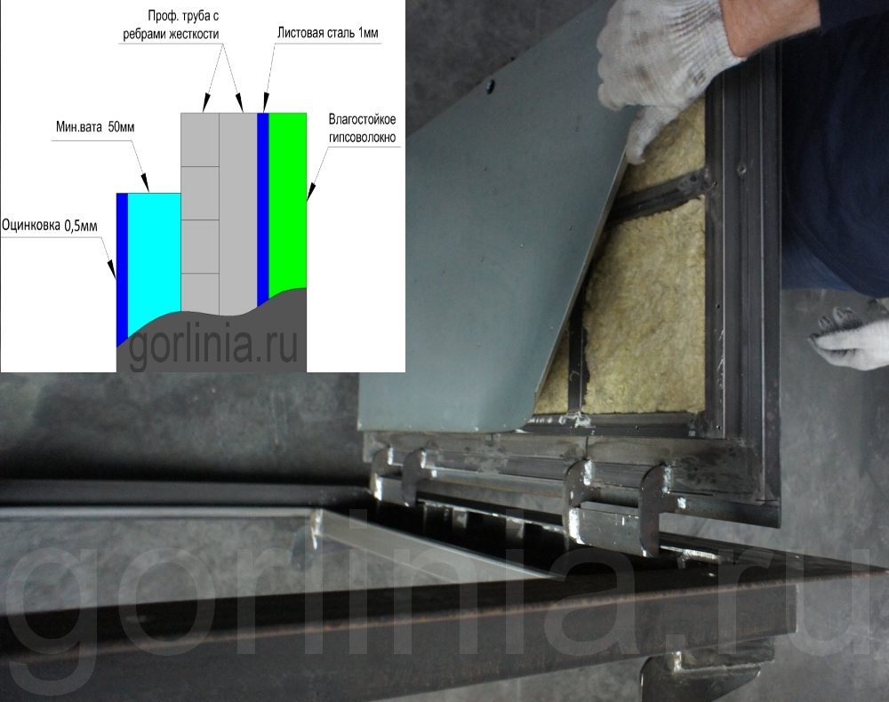 В закрытом положении дверка лежит на трубе 15х15 по трем сторонам, по петлевой держится на осях подшипника шарниров. Уплотнитель проложен по четырем сторонам. Снизу щель над петлями закрыта специальным поддоном для предотвращения тяги из подвала.